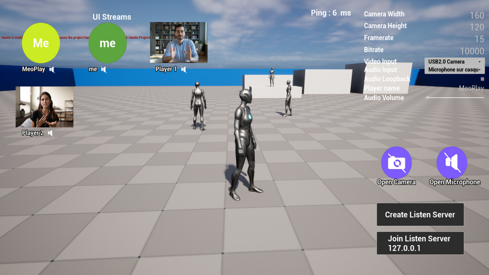 - Technologies : FFmpeg, VP8 Video codec, Opus Audio codec, Unreal Networking system